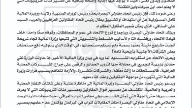 بيان تعزية صادر عن اتحاد مقاولي البصرة بالذكرى السنوية لاستشهاد السيد الشهيد محمد الصدر ونجليه