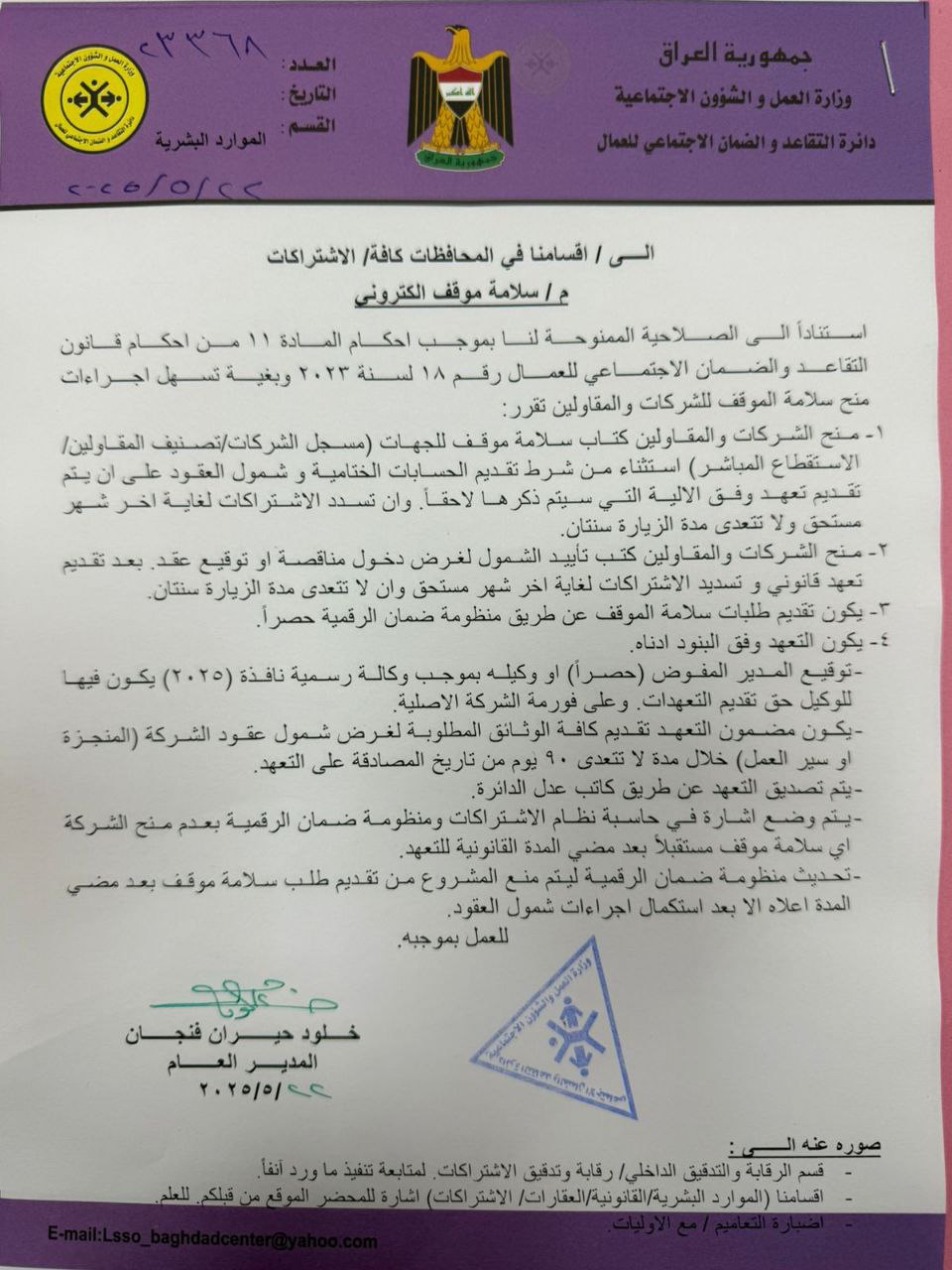 كما أعلن المالكي عن افتتاح مكتب خاص في مقر اتحاد مقاولي البصرة لتنظيم استمارات المنصة وفق ضوابط دائرة الضمان، بما يضمن الدقة ويجنب المقاولين التعامل مع المكاتب غير الرسمية، مشيرًا إلى توجيه فروع الاتحاد كافة باعتماد هذا المكتب كمصدر رسمي للحصول على استمارة الباركود المعتمدة.