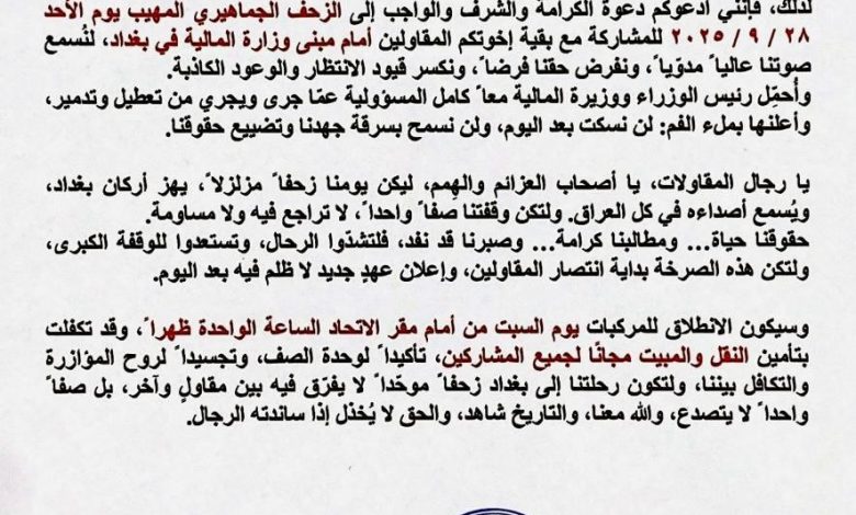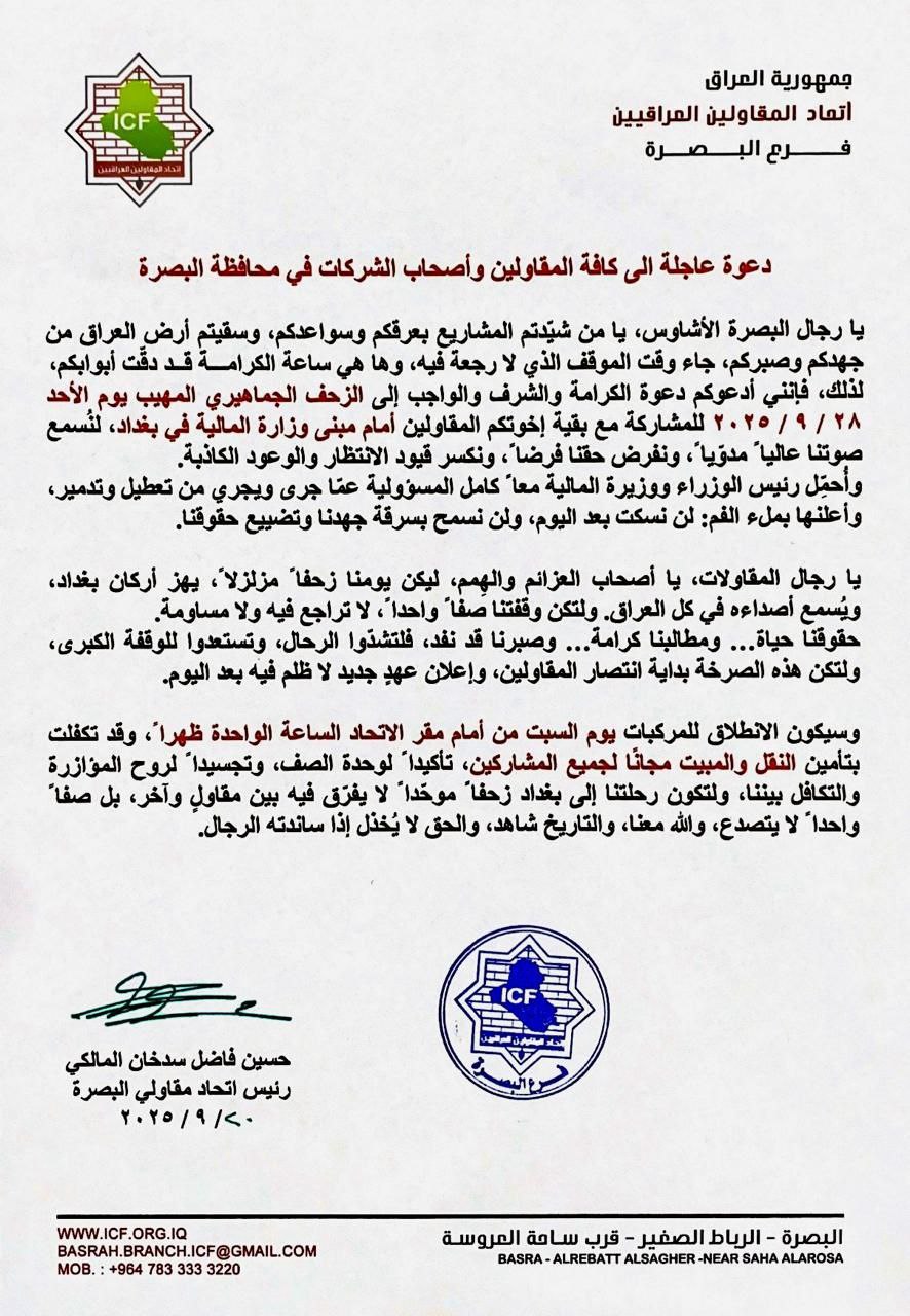 رئيس اتحاد مقاولي البصرة يستنفر المقاولين والشركات ويدعوهم للاستعداد والمشاركة في التظاهر أمام وزارة المالية