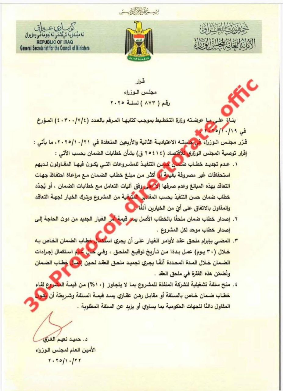بالوثيقة : مجلس الوزراء يصدر تعليمات جديدة بخصوص خطابات الضمان للمشاريع.