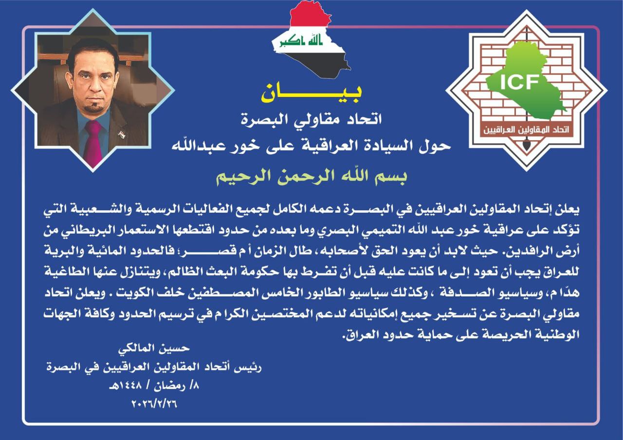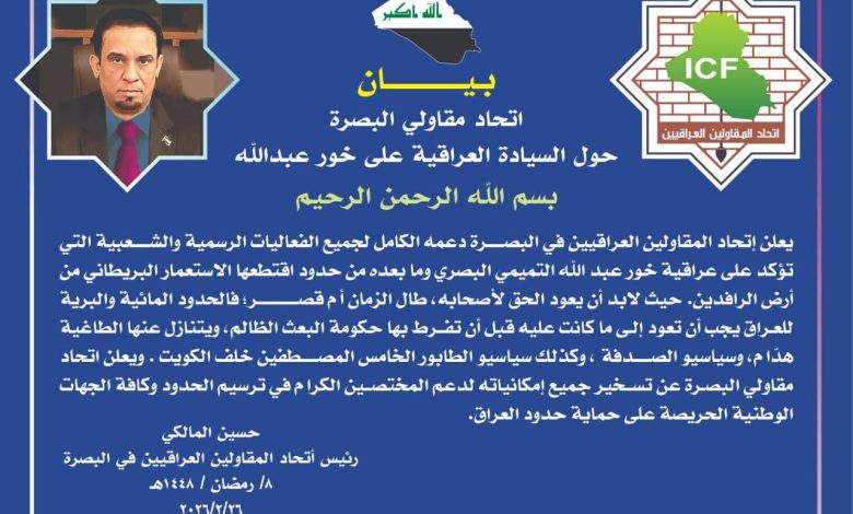 بيان اتحاد المقاولين العراقيين في البصرة حول السيادة العراقية على خور عبد الله